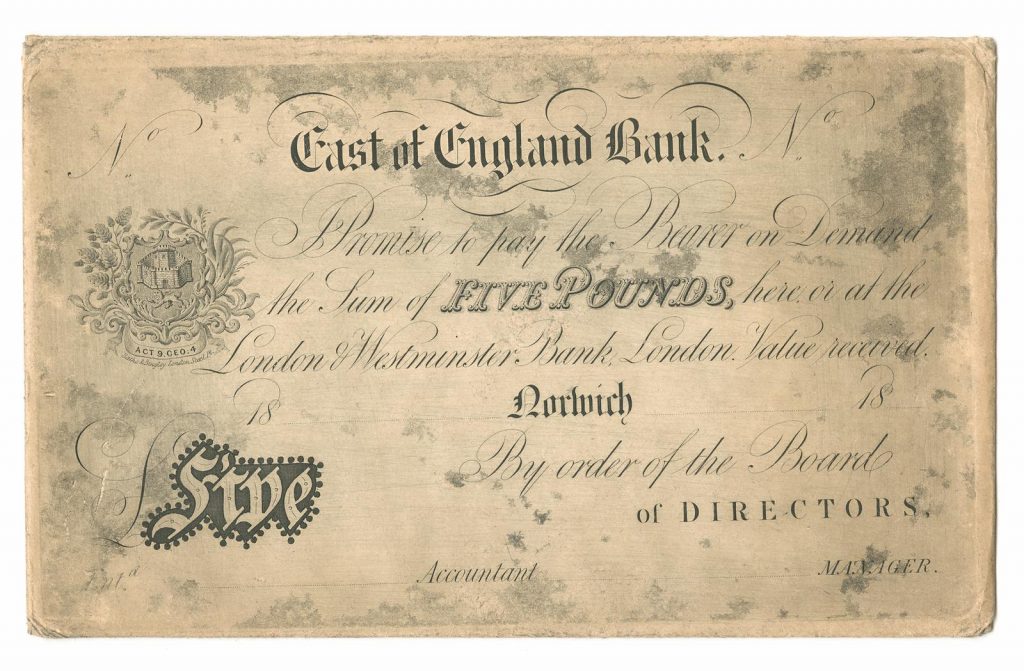 “The East of England Bank was established in 1836 with paid up capital of £100,000 and note circulation of £25,000. The bank expanded rapidly, opening 33 branches across Norfolk and Suffolk, but got into difficulty and suspended payment on 20 July 1864. The six directors were a farmer, a retired draper, a clergyman, a surgeon, a retired commercial traveller and a Yarmouth wharfinger. The solicitor’s report said, ‘The Books and Accounts of the Bank are admirably kept and if the management had been as good as the book keeping the . . . state of affairs . . . would not have arrived.’ The company was reconstructed as the Provincial Banking Corporation, which bought the premises, other assets and accounts of the East of England for £11,625 9s. 6d.”