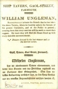 The Ship Tavern is though sadly no longer trading, it lasted from the 1760s until 2010, being located next to Row 84 in the town. But there’s something quite captivating about how multi-national the docks and port of Great Yarmouth once were. Indeed, in 1797 this pub had welcomed (I use welcomed slightly loosely here….) Dutch naval prisoners from the Battle of Camperdown. As for William Ungleman who produced these trade cards, he ran the pub between September 1809 and 1819, but I have no idea where he went after that.