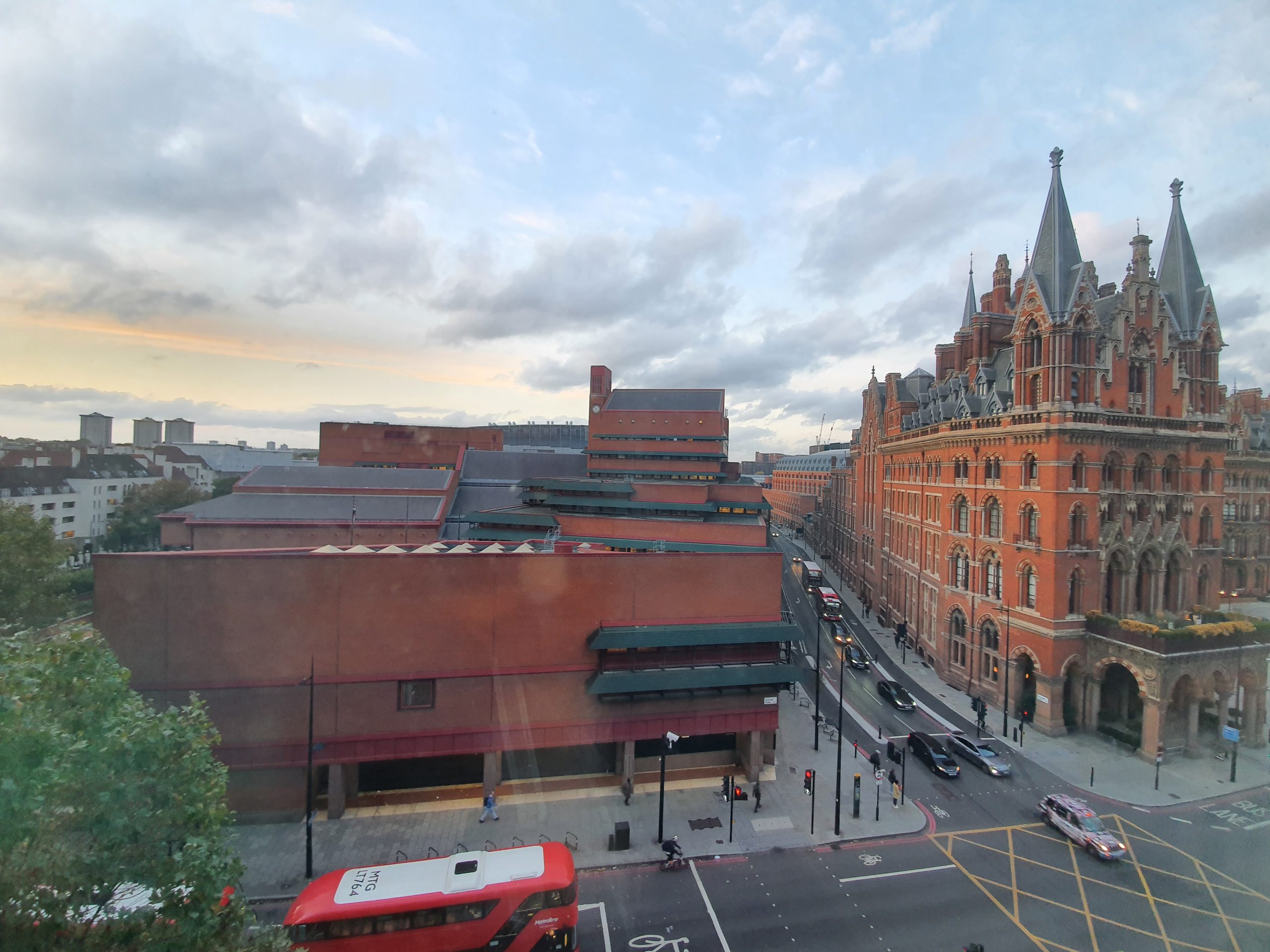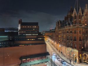 And a rather lovely view from the window. That’s the British Library on the left, reminding me that I haven’t used my Reader’s Card recently. The building on the right is the St. Pancras Renaissance Hotel, the hugely impressive hotel designed by George Gilbert Scott. It’s out of my price range as it’s five-star luxury, but it’s worth noting that British Rail tried to demolish it in the 1960s. Great foresight as ever.
