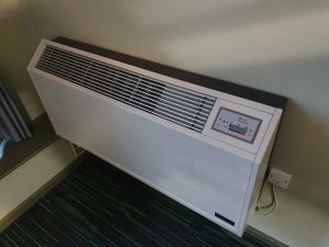 The now switched-off air conditioning unit which is one of the largest I’ve seen and must have been from a previous incarnation of the building. There was also a working heater and fan in the room though to manage the temperature.