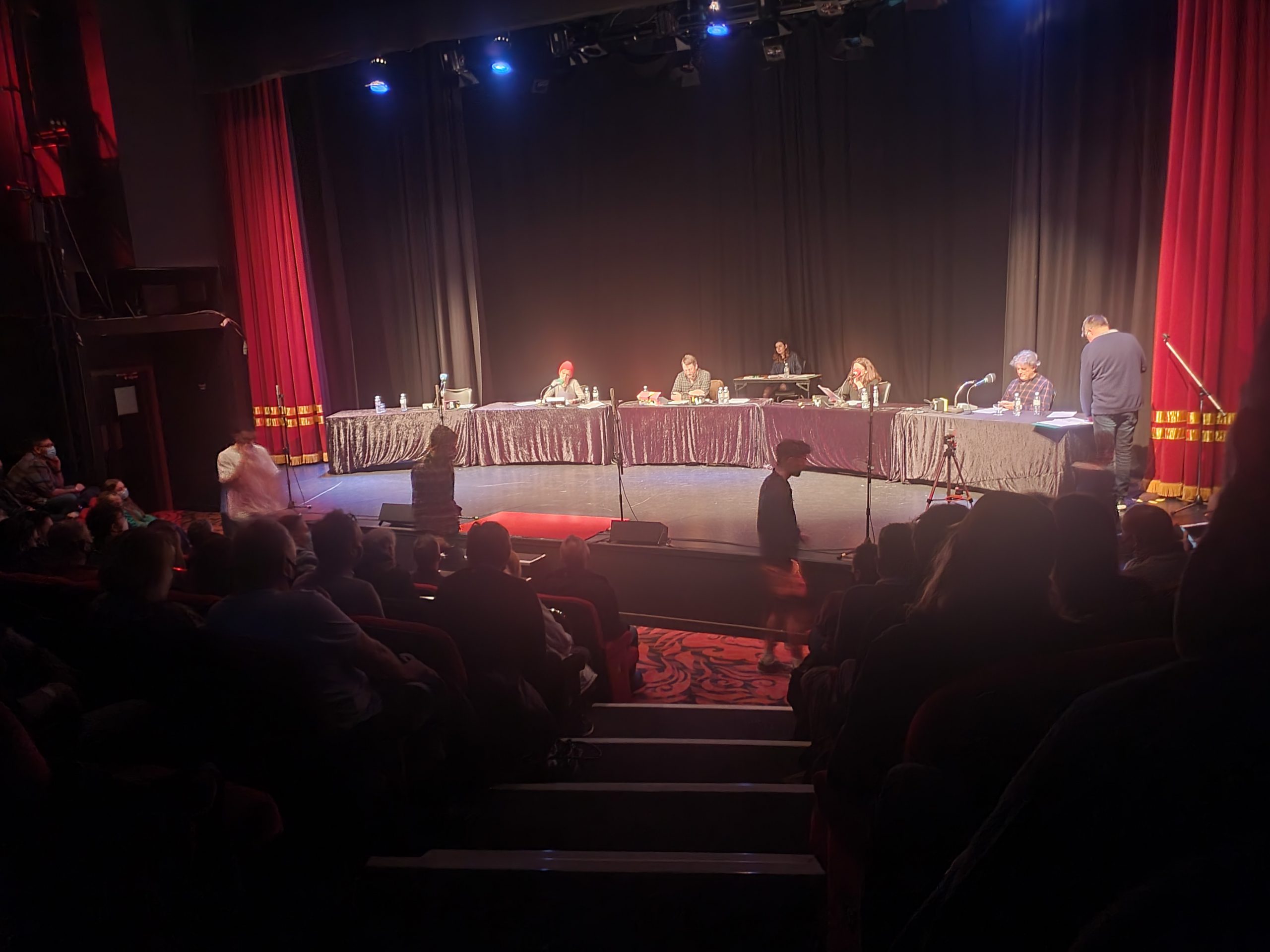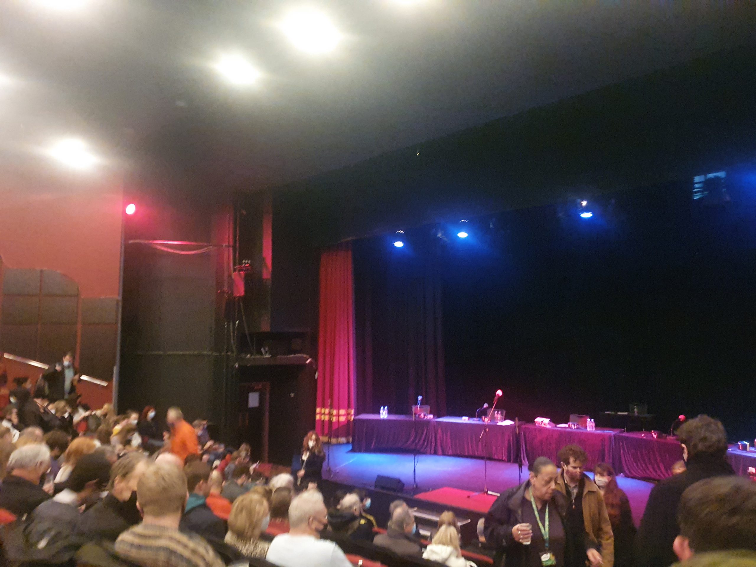 I noticed that two people were taking photos with flash during the performance and others were recording bits, I’m not sure if the production company noticed or whether they weren’t too bothered. I suspect there isn’t a huge market for advance clips of a Radio 4 show, but I’m sure it’s not ideal. Either way, since lots of photos were taken between the two episodes (and I’ve seen several on social media already, which is the reason I’m justifying posting my photo), and therefore here’s mine. Incidentally, a lot of audience members seemed to think that the bit between the two shows was time to get drinks and have a long toilet break, with David Mitchell commenting an unusually number of people were leaving. But, they came back which was probably a relief to the production company, although the recording wasn’t held up to wait for that.