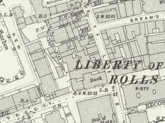 And here’s the area 100 years ago, the toilets are located where it says Star Yard on the map. The bank on the nearby corner is now a JD Wetherspoon outlet, the Knights Templar.