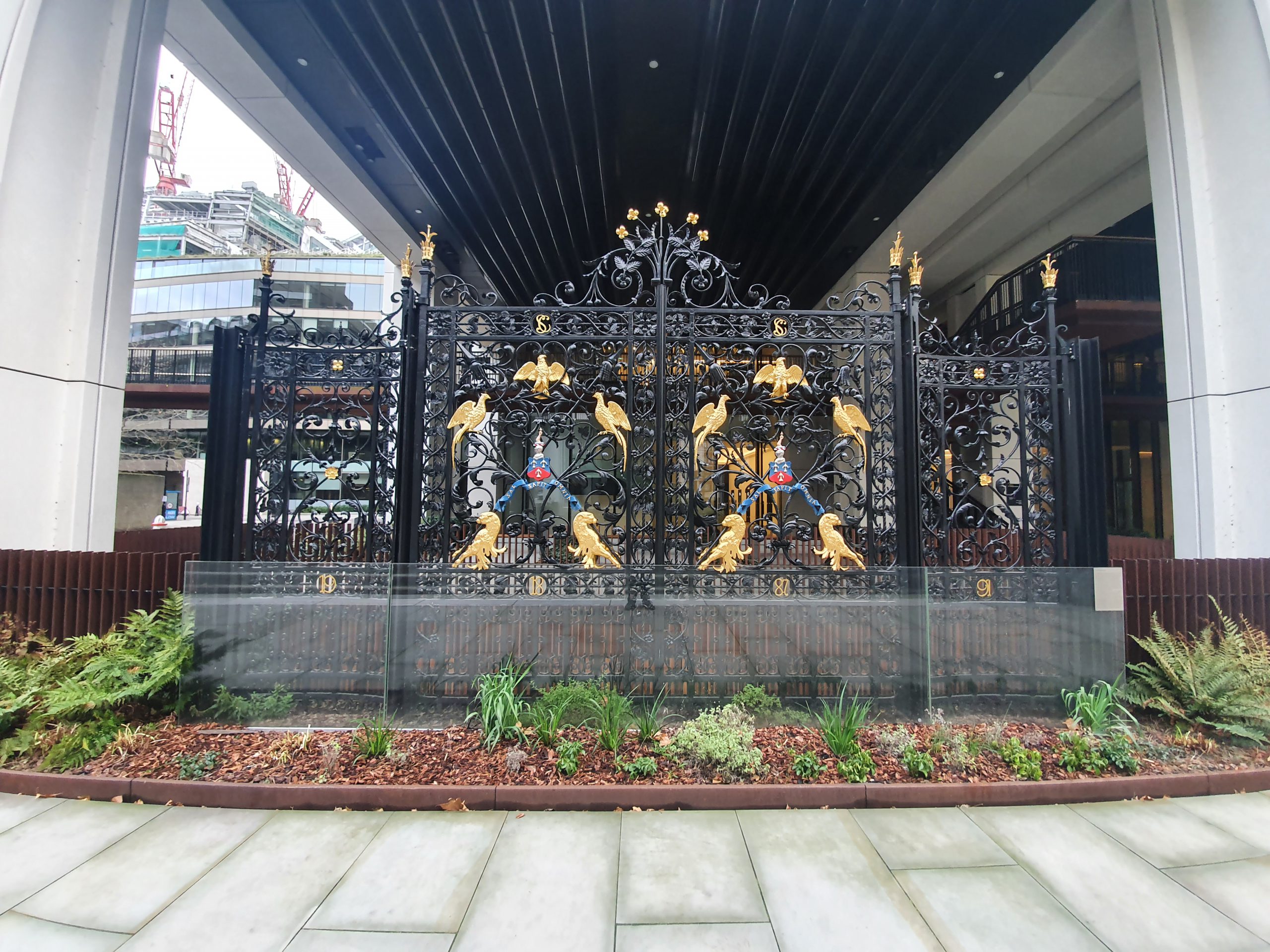 These gates are near to Fore Street, situated a few metres away from the Minotaur sculpture, but these have just a little more relevance to their surroundings. They are the gates purchased in 1887 by Salters’ Hall for their building then located off St. Swithin’s Lane. The gates weren’t specifically created for them, they had been displayed at the International Exhibition and were commissioned by Prince Albert (1819-1861) and designed by John Thomas (1813-1862) at the beginning of the 1860s, but they then both died and so it’s fair to say the project lost its shine a little. There were a few little amendments for the new owners, such as the addition of the Salters’ crest, but then they were good to go. And I’m sure that everyone was pleased with the gates until the 1941 Blitz saw Salters’ Hall destroyed. On the bright side, they still had the gates. In 1949, they were moved to Salters’ Almhouses in Watford and in 2017 they were moved to their current location, near to the new Salters’ Hall.