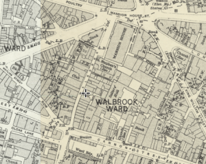 The original location of the gates at the old Salters’ Hall (clicking on the map makes it larger).