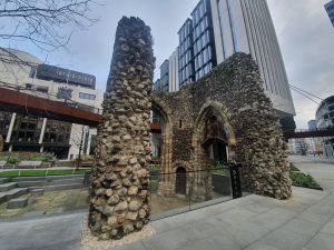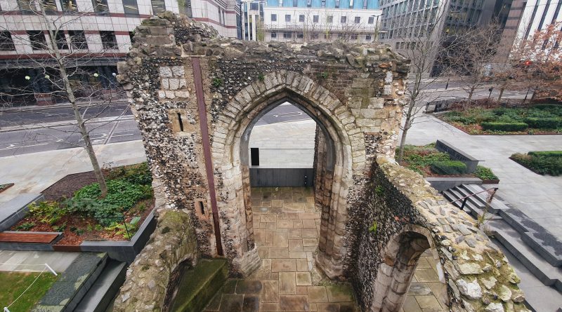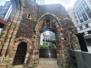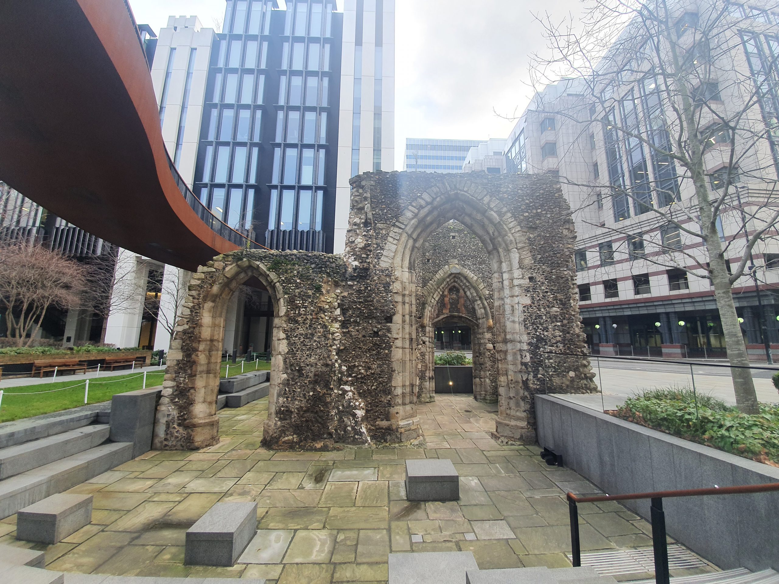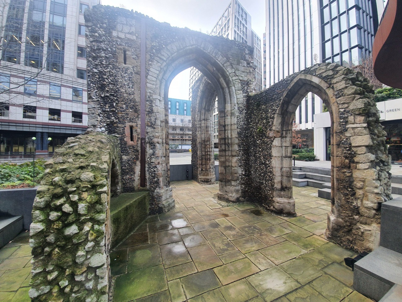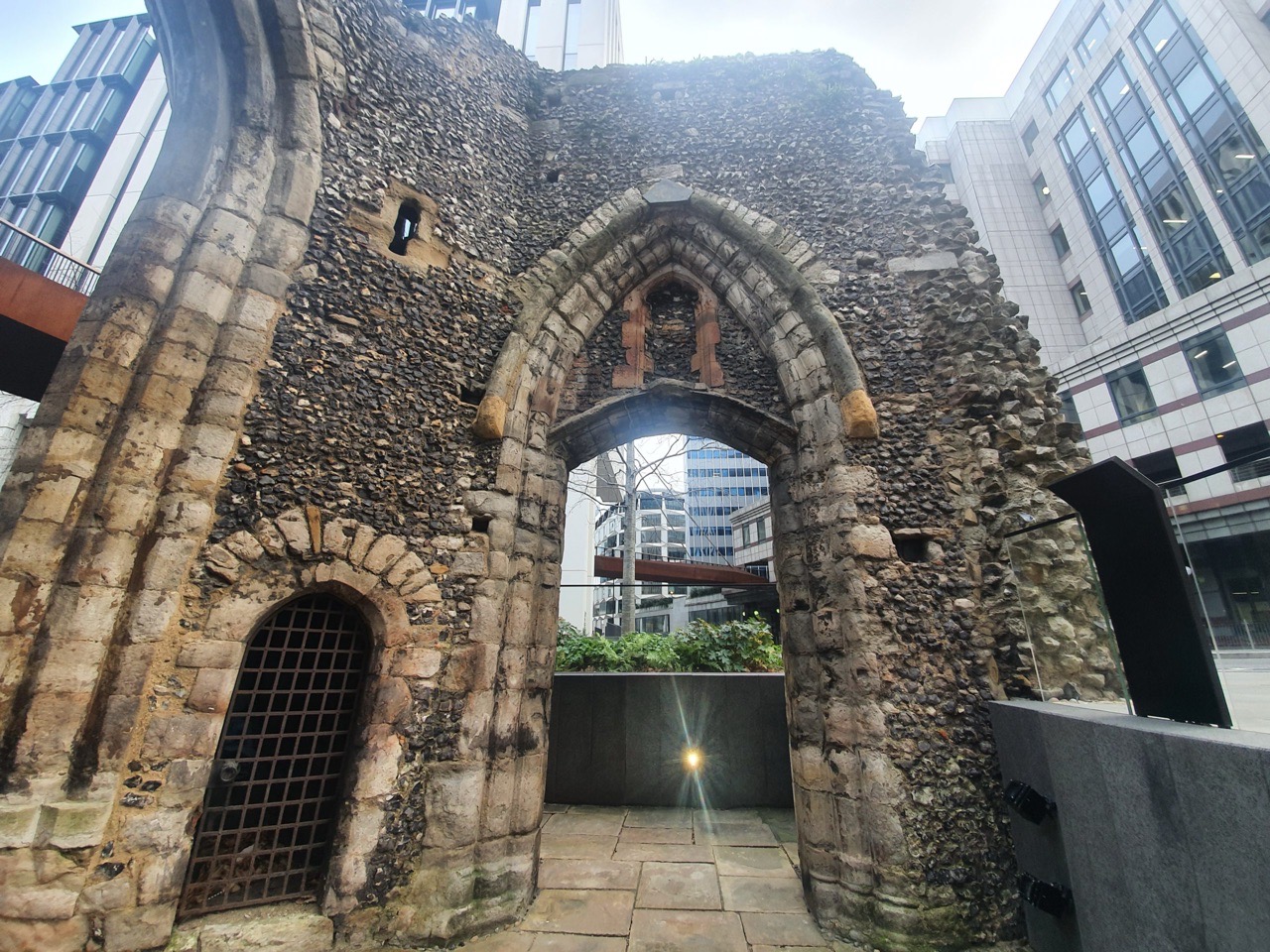 Located on London Wall, the road named after the Roman defensive wall, this is all that remains of St Elsyng Spital church. It was part of the structures built by William Elsyng, a wealthy London merchant, as a hospital in 1330 to help the poorest members of society in medieval London.