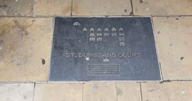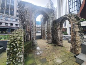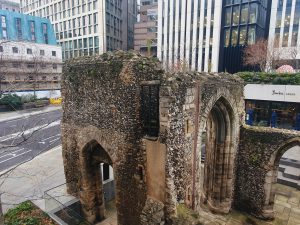 The cloisters and cemetery would have been off to the right, under what is now London Wall road. The church was damaged in a First World War air raid and part of it was reconstructed in 1919, but the nave was removed in 1923. This wasn’t an entirely destructive process in terms of the history, as the nave of the building only dated to between 1774 and 1777 when it was rebuilt as the old church was falling down, but they did keep the original tower. Following the demolition, the tower and porch were turned into a small church of its own, but this was in turn damaged during an air raid during the Second World War, with the area being comprehensively redesigned.