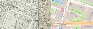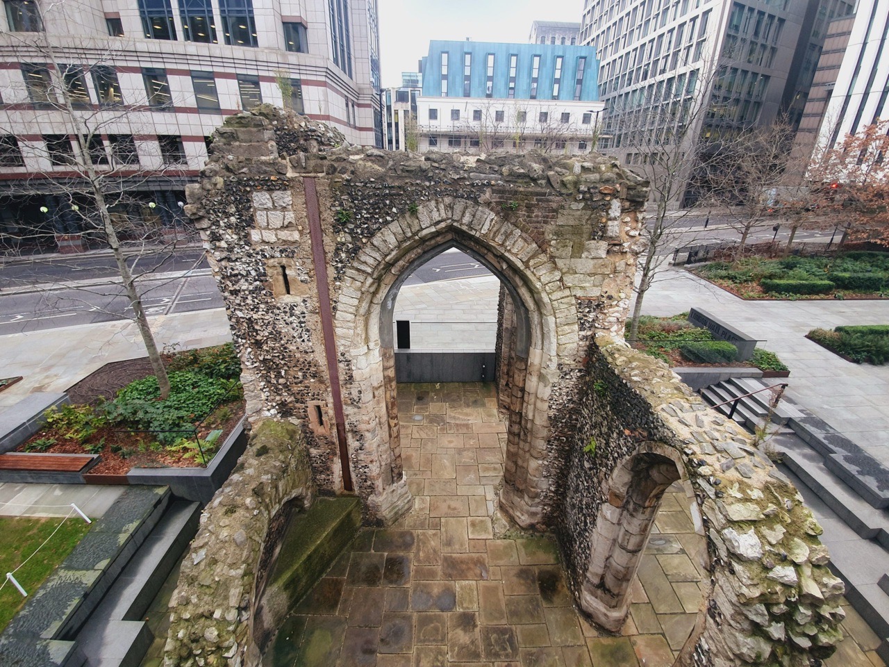 Clicking on this image will make it larger and it’s the site in around 1900 and next to it, what there is today. Reconstruction following the Second World War saw much of this area swept away, but the remains of the church were kept. The landscape has changed substantially though, London Wall now ploughs through this part of London and the area has been opened up to the public. The little cursor on the map on the left is where the remains of the tower stand today.