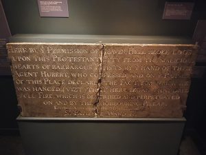 The actual state of the plaque is a little more complex than the signage at the museum suggests, as the plaque was taken down on the orders of King James II, not unsurprising as he was a Catholic monarch (the last one in this country). King William III ordered it back up again, before its removal for the traffic reason mentioned by the museum, probably in around 1750 to 1755.