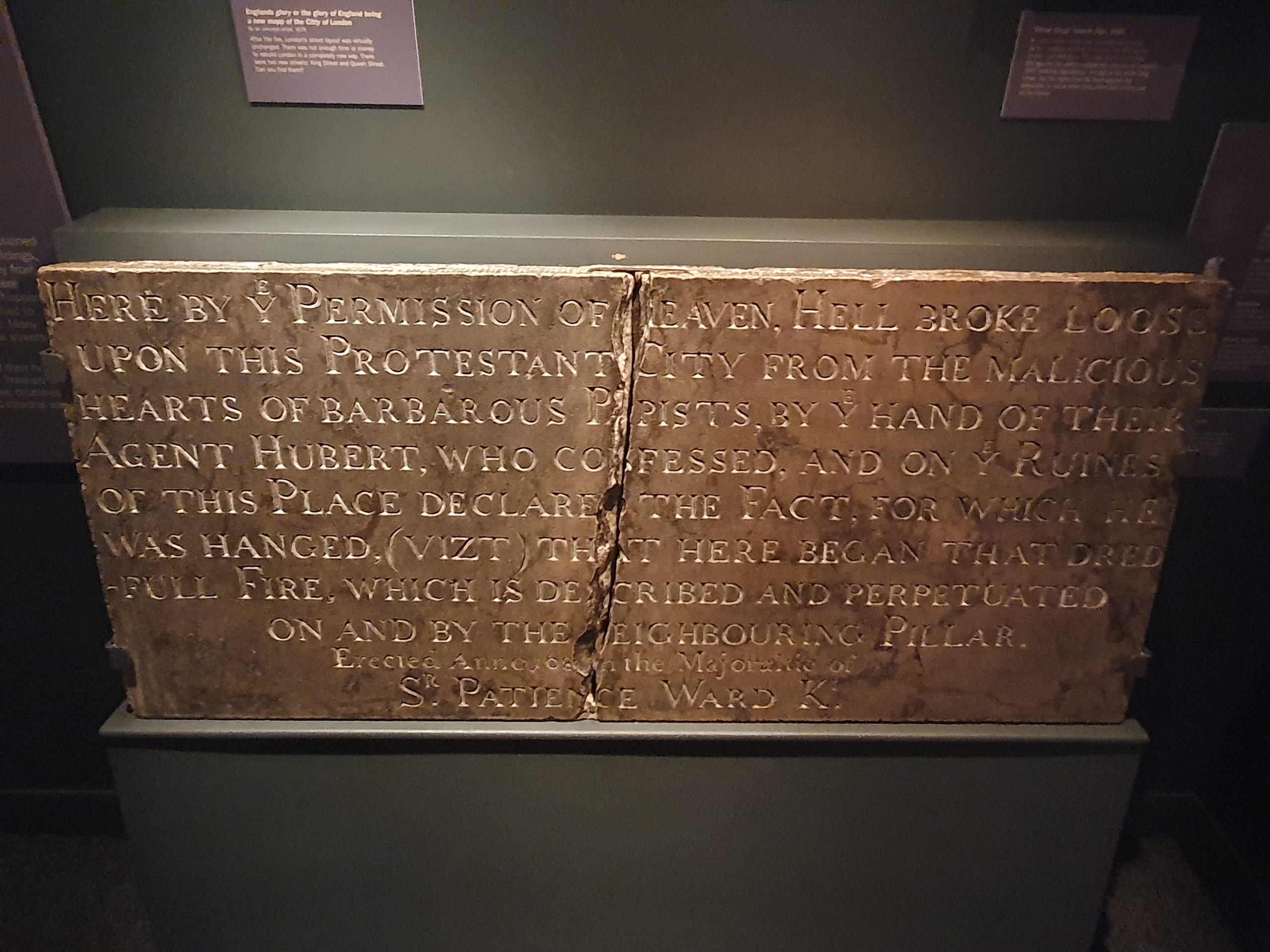 “Here by ye permission of heaven, hell broke loose upon this Protestant City from the malicious hearts of barbarous Papists, by ye hand of their agent Hubert, who confessed, and on ye ruins of this place declared the fact, for which he was hanged vizt. that here began that dreadful fire, which is described and perpetuated on and by the neighbouring pillar.”