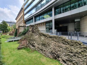 The Roman wall was built in one go to defend the city, starting in around 190AD and being completed by around 225AD. It served as the boundary wall of London until the medieval period and it wasn’t much changed until the sixteenth century, just some strengthening works in places.
