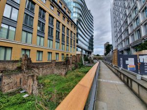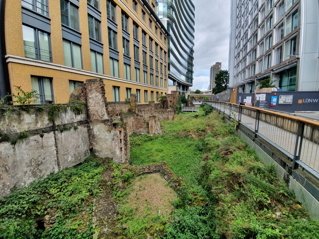 The bits of brickwork jutting out are from eighteenth to twentieth-century buildings that were damaged or destroyed during the Second World War. There were extensive archaeological investigations here in the late 1940s and 1950s, with a decision being made to protect the area and to prohibit redevelopment.