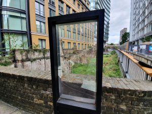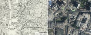The Second World War brought many changes to the streets of London, including the uncovering of pieces of the city’s past. The above map (click to make it larger) is from 1900 on the left and from today on the right, with Noble Street looking very different. Properties had been built backing onto the Roman wall and it had been covered up over the centuries, but the wartime bombings of the city brought the wall back into view.