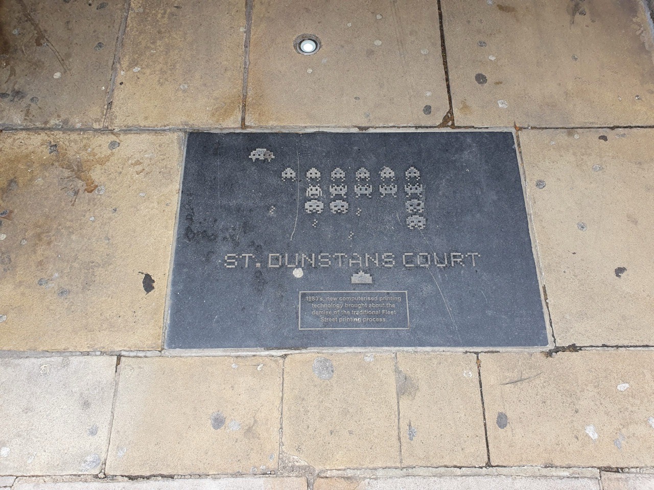 Each of the courts off Fleet Street on the north side of the road has tablets which show the heritage of the newspaper industry, which is what this area was once known for. This one shows the 1980s computerised printing technology that was introduced, that brought about the demise of the traditional printed processes. The usage of the Space Invaders as an example of something from the 1980s is perhaps a little obscure, but it stands out on the pavement.