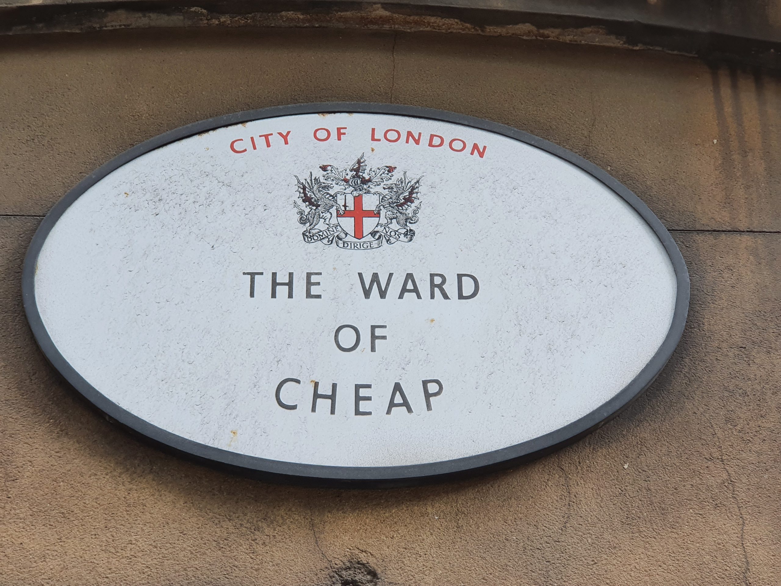 I like this sign, but the modern meaning of the word isn’t the same as the old meaning, which is from ‘chep’, meaning market, derived from the old English ‘cēap’. However, they’re linked, as the modern meaning evolved from a fifteenth-century phrase which was ‘good cheap‘. That means a decent deal from a market-trader, so there’s a pleasant circular nature to all of this.