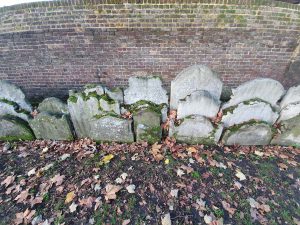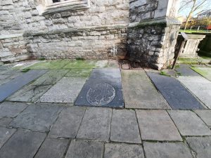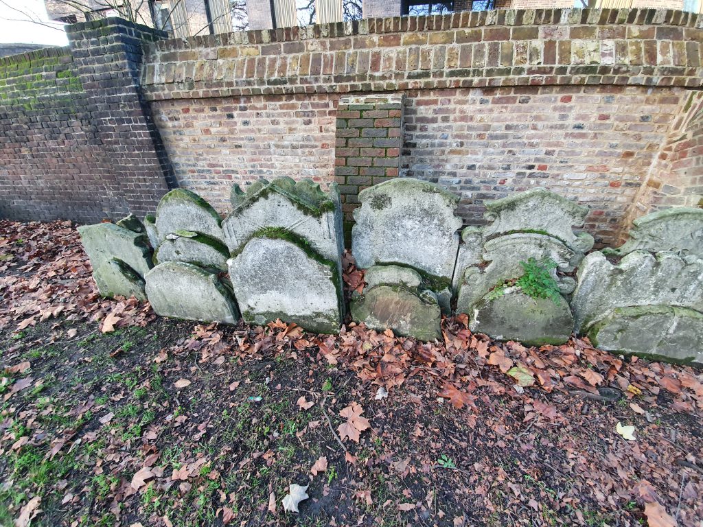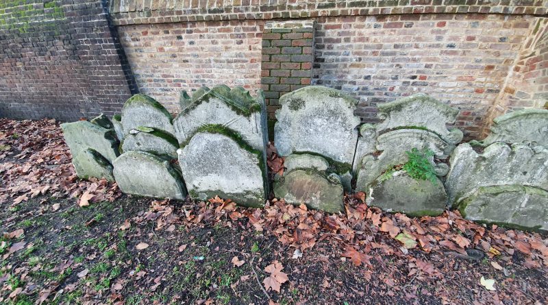 I’m not at all impressed at this little arrangement, where the stones from the graveyard have all been collected up and placed at the side of the park. Although, this may well have had the effect of saving some of the stones from the damage which would have been done through pollution and weathering. I don’t know when this was done, but, at a guess, I suspect it was in 1885 when the public gardens were laid out. It was certainly done by 1908, as the book mentioned in the next paragraph notes that some gravestones were lost and the rest were stacked three abreast around the outside.