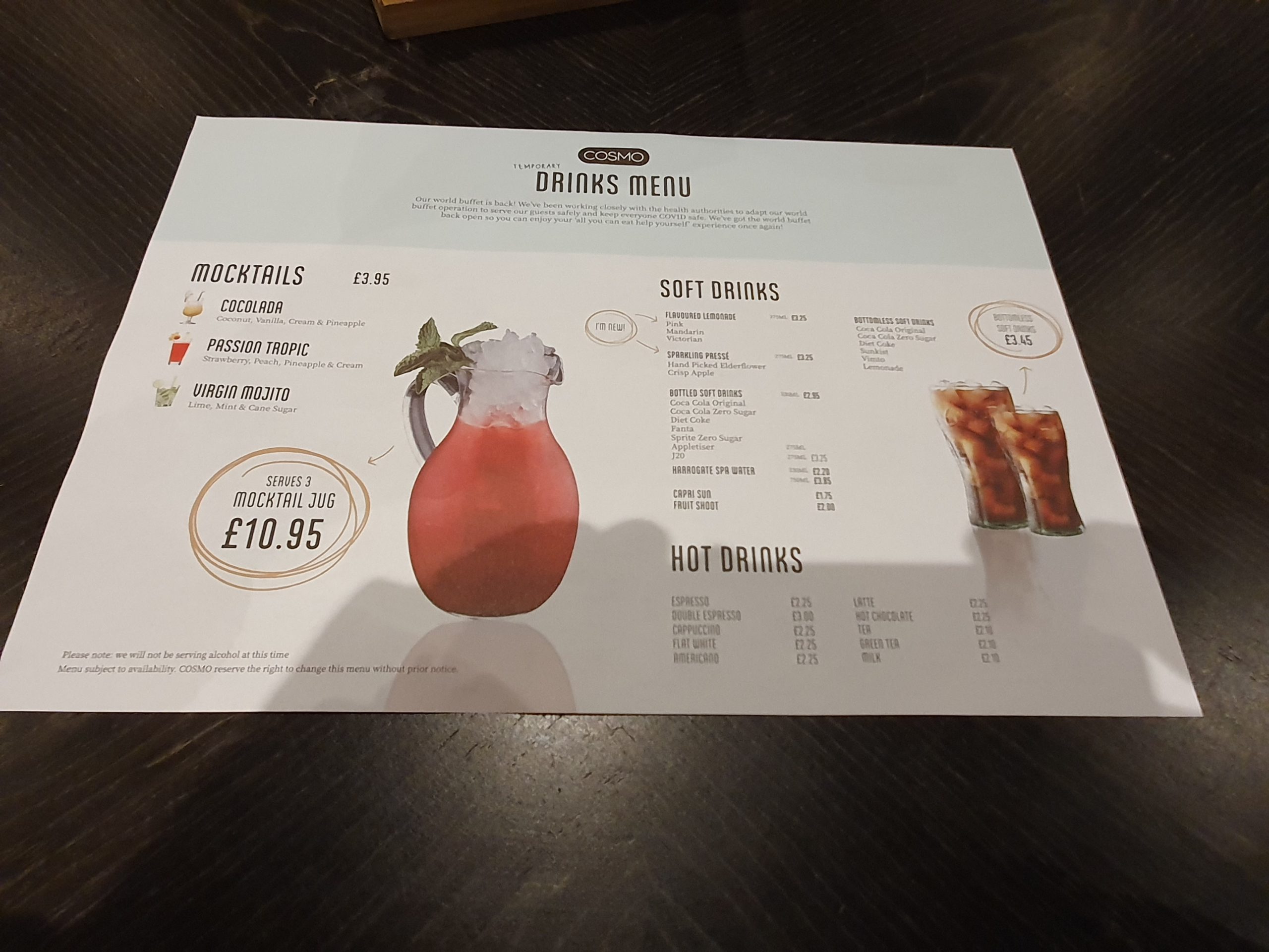 The interior of the restaurant, which was moderately busy, but by no means packed. The service was efficient and payment is now taken during the middle of the meal, which is an interesting time to take it. The unlimited soft drink offer remains, but the staff now get drinks for customers. Cosmo have also temporarily surrendered their alcohol licence for the time being, although their drinks selection in this regard has never surprised and delighted me. So I stuck to Vimto.
