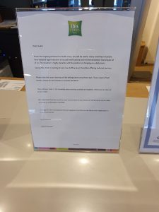 The sign at reception explaining what’s changed. Cleaning is now only offered on the third day and breakfast has been switched to a bag offered at reception. I had guessed this, but it’s perhaps inadequate that Accor don’t make this clear. Accor’s press office says that every hotel offers the same breakfast (I had wanted to ask numerous hotels what breakfasts they were doing, something they’re communicating badly), but this is a complete nonsense and their PR agency does no-one any good by suggesting it is. They didn’t offer the same breakfast before, so why they should be now, I have no idea. Anyway, I digress.