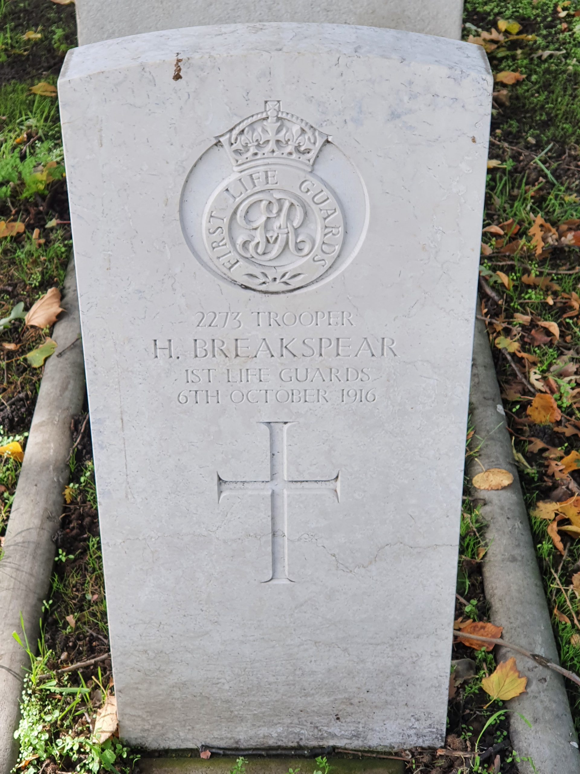 This grave is located at Brompton Cemetery in London and commemorates the life of Henry Breakspear. There’s not a lot of information at the Commonwealth War Graves web-site, but as is noted on the grave, his service number was 2273 and he was a trooper in the 1st Life Guards of the Household Cavalry. He was born in Handborough in Oxfordshire and enlisted at Oxford.