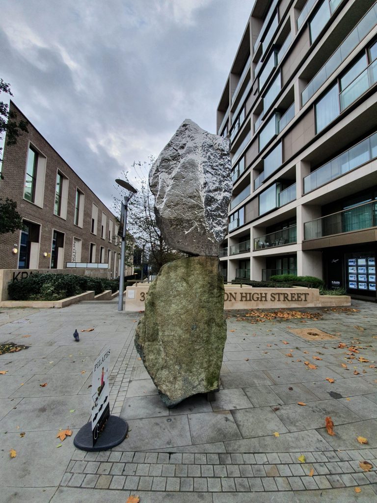 “Glorious Beauty is a playful arrangement of natural forms in an urban environment. A man made celebration of nature’s beauty that echoes a piece of the natural world and represents innovation, technology and a fast changing world. The solidity of a large glacial boulder sitting in the urban world has a reassuring permanence to it. Seemingly weightless, balanced on the top of the boulder is a mirrored copy of its form in stainless steel. Simon digitally scanned the boulder and flipped its form to create a mirror image which reflects the size and intricate detail of the original. Standing almost as tall as a double decker bus, its presence is captivating. The surface of Glorious Beauty gives the impression of an endless state of flux, due to the ever-changing distorted reflections in it as people pass by.”