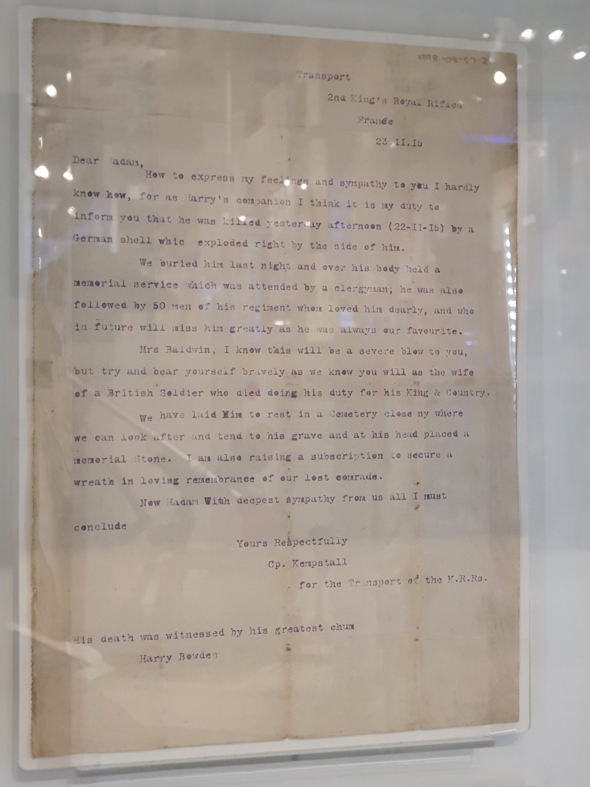 The museum notes that the place of death is never given, although there’s an address at the top of the letter which is the 2nd King’s Royal Rifles in France. I can find details of only one Harry Baldwin dying in 1915 and that person died on 22 November 1915, so I assume it must be the same one unless there’s something of a coincidence. Given that, the letter is nonsense, as Harry died in Basra fighting the Ottomans, so he wouldn’t likely have been killed by a German shell. Harry was buried near Basra, at a war cemetery which was moved to a new location in 1997.