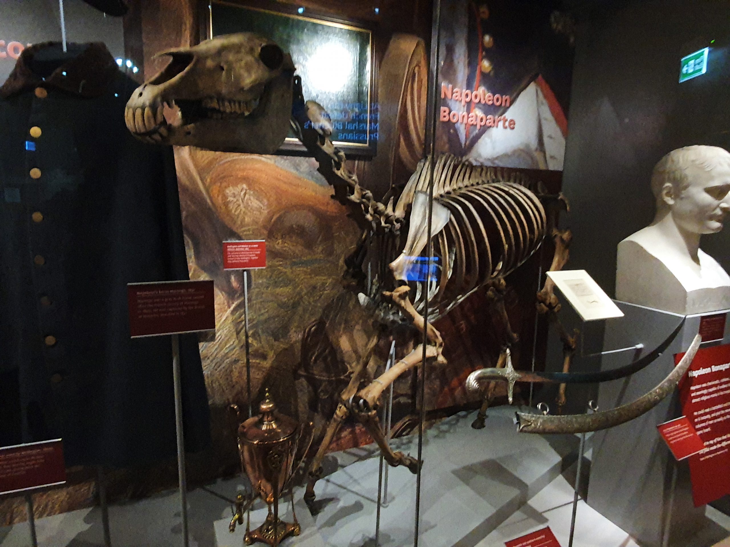 Now at the National Army Museum, I think the skeleton is clumsily displayed and I wasn’t sure why he wasn’t placed in an area of his own. It transpires that this was what the previous museum authorities thought was a good idea, it’s a recent innovation that he’s been shoved in this cluttered display. He’s missing a couple of hooves, which were taken for souvenirs and are now displayed elsewhere.