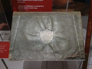 This is the despatch case that was used by the Duke of Wellington during the Peninsular War of 1808 until 1814 and at the Battle of Waterloo in 1815. The National Army Museum acquired it in 1973, but their web-site isn’t very good at providing the provenance of items or where they’ve been. The museum notes Wellington’s quote, when asked why he was so successful, of “I was always on the spot – I saw everything; and did everything for myself”.