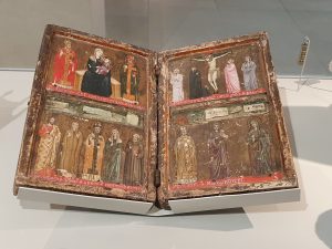 This rather lovely item (or, to be precise, two items as it’s two halves of a folding reliquary and has two catalogue numbers) is in the collections of the Victoria and Albert Museum. And, whilst I’m wittering on, I’m very impressed at the level of information about this item (and I’m hoping many others) on their web-site, there are tens of paragraphs of information about these reliquaries and far more than I can ever really understand.