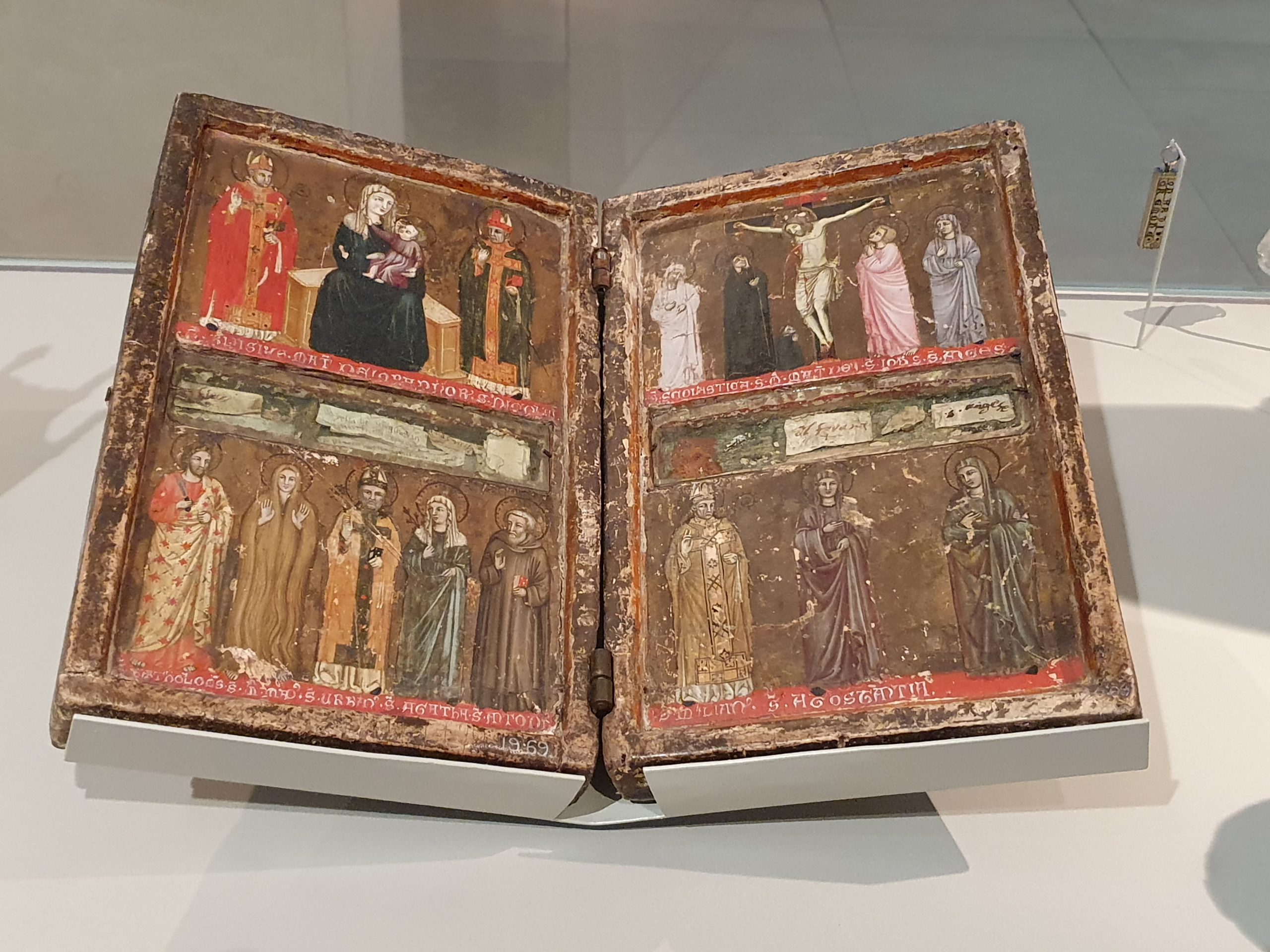 I like reliquaries, especially personal ones which would have been deeply important to their owners, although this was likely made for a monastery. This one is thought to have been made in Spoleto, a town nearby to Perugia in Italy, in the 1320s. Some of the relics are still in the recessed area, although others are missing or have moved about. It’s not entirely clear who each item was associated with, but there are a few bone fragments.