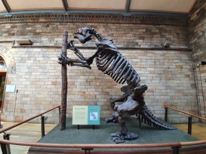 A plaster cast of Megatherium, one of the largest mammals that has lived, and it’s effectively just a giant ground sloth. This cast was made in 1848 from two different skeletons and it’s been on display in the museum since 1850. I’m sure that, even at this large size, it still looked quite adorable and the animal could be as long as six metres in length from head to tail. They were found in the Americas and one of the reasons thought for their extinction around 12,000 years ago is human movement into the areas where they lived.