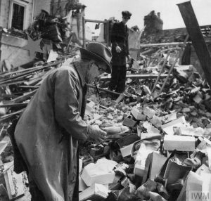 From the collections of the Imperial War Museum (© IWM HU 140004), I’ve never seen this photo before. There’s no address on it, but it was taken in Norwich following a Baedeker Raid which took place on 29 April 1942. The man was the owner of the shoe shop which had been destroyed, looking through to see if he could salvage any of his stock.