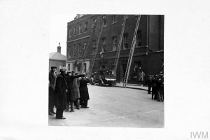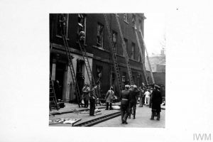 Repairing the damage with ladders. This was towards the end of the bombings in London, the last Luftwaffe air raids were in May 1944.