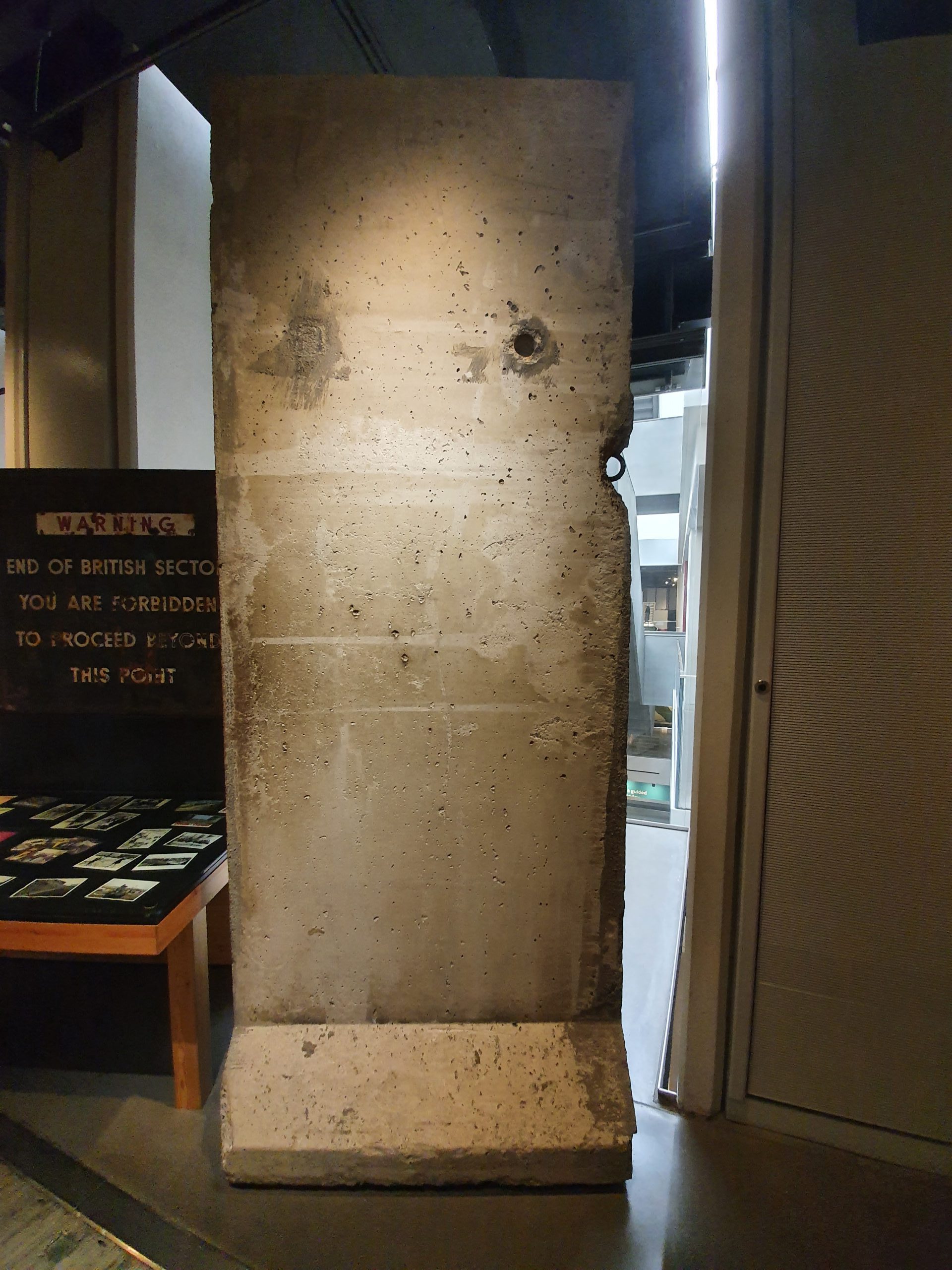 The Imperial War Museum has two sections of the Berlin Wall, this one is located within the galleries and the other is outside the entrance to the museum. There’s not much information given about this section, simply that it’s from the late 1970s and it’s made of reinforced concrete. It weighs over two and a half tons and stands just over two metres high, although it’s not as painted on as their other section. The Imperial War Museum also has a small fragment of the wall collected by the British Military Forces in Berlin and this is on display at the museum’s outpost in Manchester.