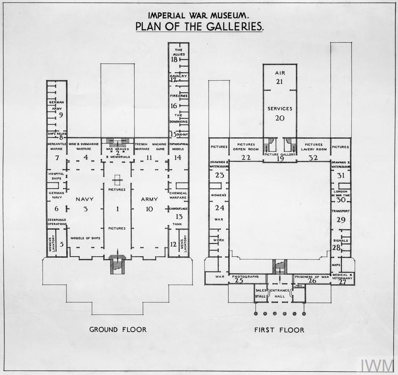 This plan (© IWM Q 60569) of the galleries of the Imperial War Museum dates to 1936 and would have been when they moved to their current site at the former Bethlem Royal Hospital. And, I have to say, I like this kind of layout for a museum, there’s a clear narrative to the story and it seems appealing to me looking at the map. This is probably why I’m not finding some current museum layouts to my taste, since it appears I’m getting on for a century out of date…..