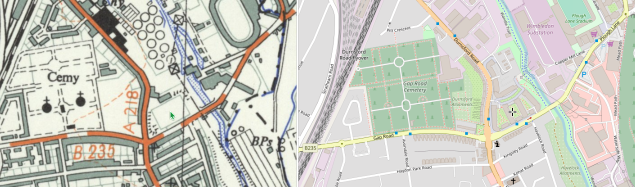Clicking on the above dual map makes it a more viewable size and it shows where Wimbledon’s football ground stood until relatively recently. It’s where the cursor is on the map and not the Plough Lane Stadium, which is where the club is now. The football team became quite notorious in the 1980s when they played at the original Plough Lane site, but the ground proved difficult to upgrade to meet new safety requirements of the time.