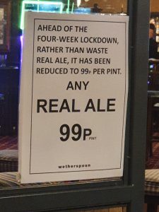 As for the 50p half pints, I did have six of them over the course of the night, which was a little excessive, but I knew that pubs were closing for a month…. They were the Cowcatcher from East London Brewing Company, Old Hooky from Hook Norton Brewery, Black Stallion from Arundel Brewery, Pure UBU from Purity Brewing Company, Gold from Exmoor Ales and Hobgoblin from Wychwood Brewery. The Pure UBU was the one that I liked the most, but it’s an interesting selection across different beer types and all of the ales were well-kept. I can imagine the annoyance that JD Wetherspoon had in having to get rid of all of this at 99p, but, as they said in their signage, it saved it from being thrown away.