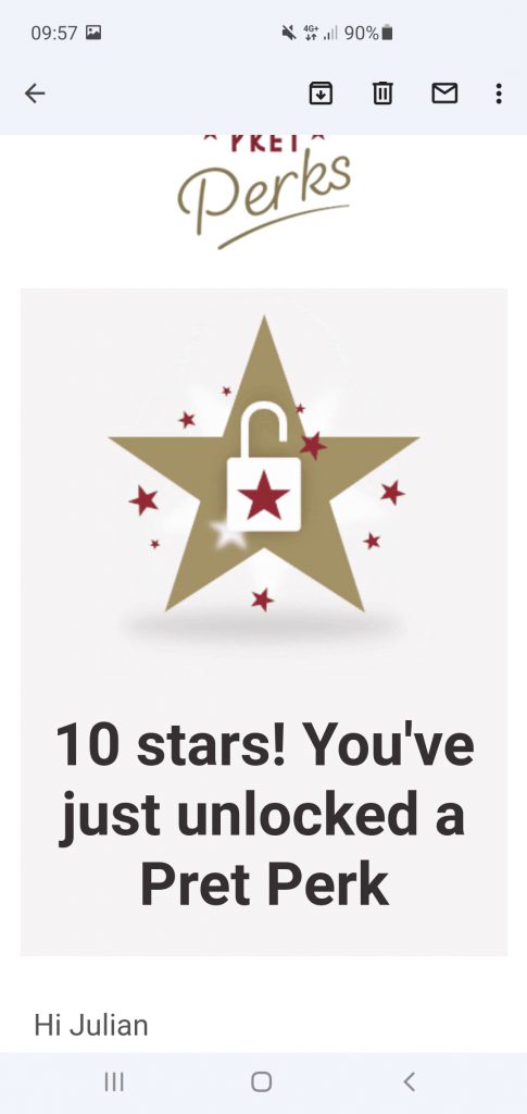 This is another one of my irrelevant posts, one in a long series. If I’m being honest with myself, the audience for this sort of post is low, even by my standards. Anyway, I won’t let that stop me. Pret have introduced a new loyalty scheme, which replaces their long-standing one where staff give free things to whoever they think looks attractive. I wanted to see what ‘Perks’ I could get, and I did Google it, but no-one seemed to know and a few people were asking. So, with the aiming of getting another two views, here’s one of the answers.