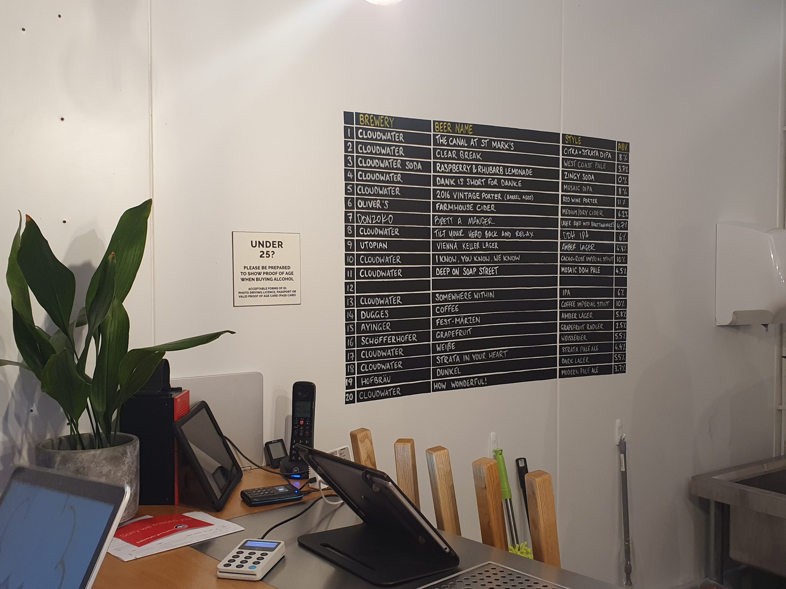 The beer list which is located on a chalkboard at the end of the bar. Service was warm and welcoming, with the staff member being knowledgeable about the various beer options. This felt a friendly location, all very on-trend.