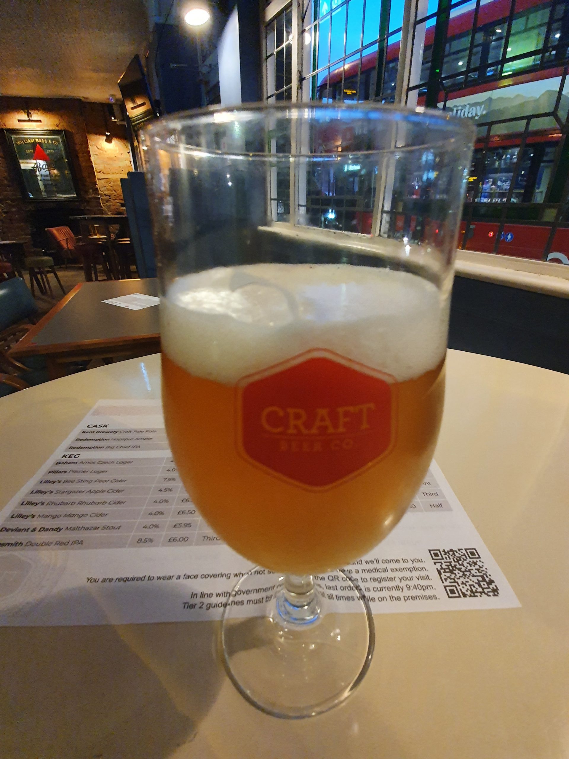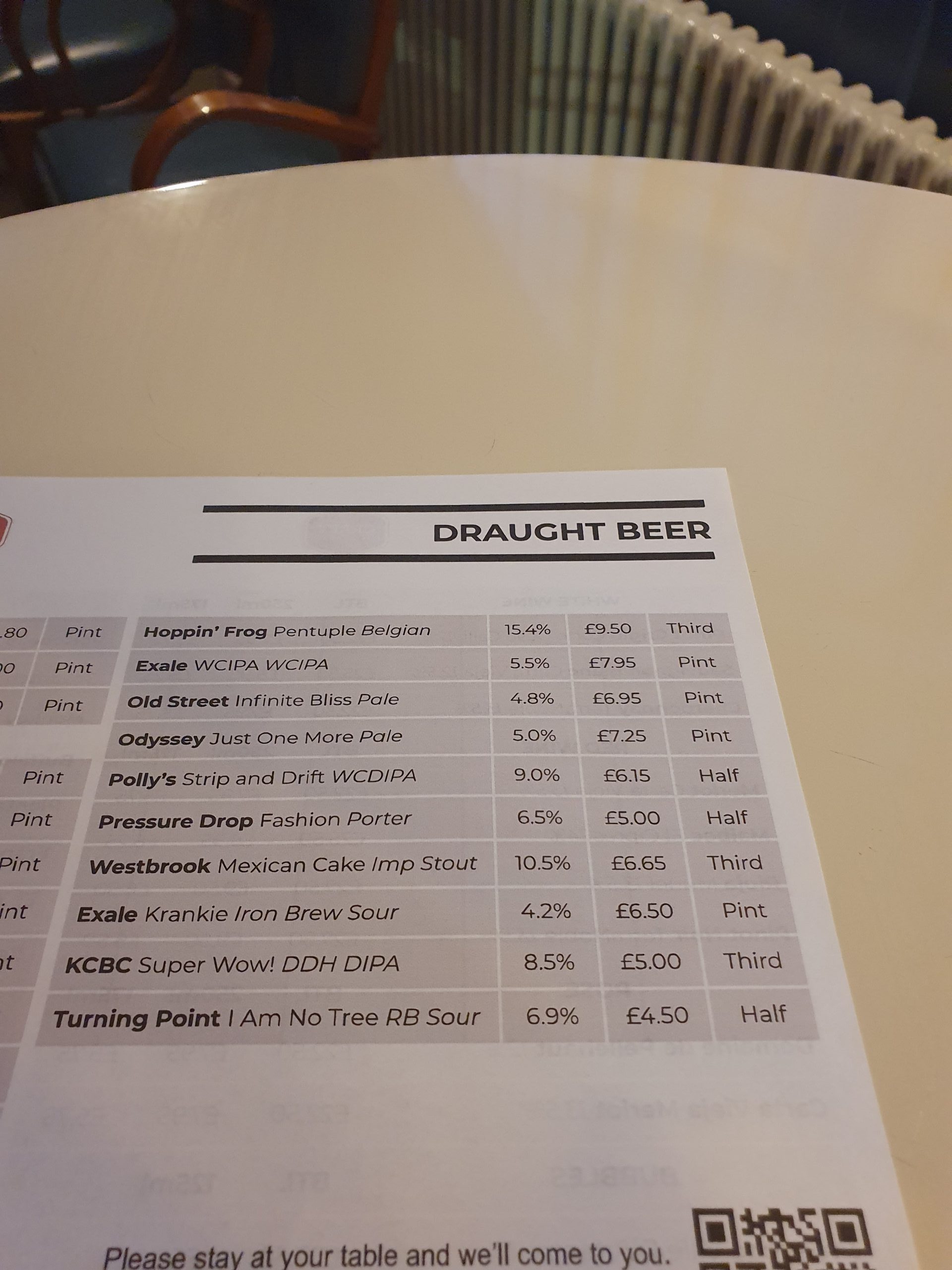 The beer menu, which is different to what is listed as the latest one on the web-site. On checking, this is because they haven’t updated their web-site since July, which isn’t perhaps ideal. Anyway, there’s a decent list of beer styles here, although a few of these beers aren’t particularly well reviewed, many are from smaller breweries and so it’s good to support them. The Mexican Cake which I had a couple of weeks is on there, but although it’s a quite brilliant beer (one of the best that I’ve had), I felt I’ve tried it enough in 2020 at that price.The Pentuple from Hoppin’ Frog sounds amazing, but it’s nearly £30 per pint and I wasn’t feeling that decadent.