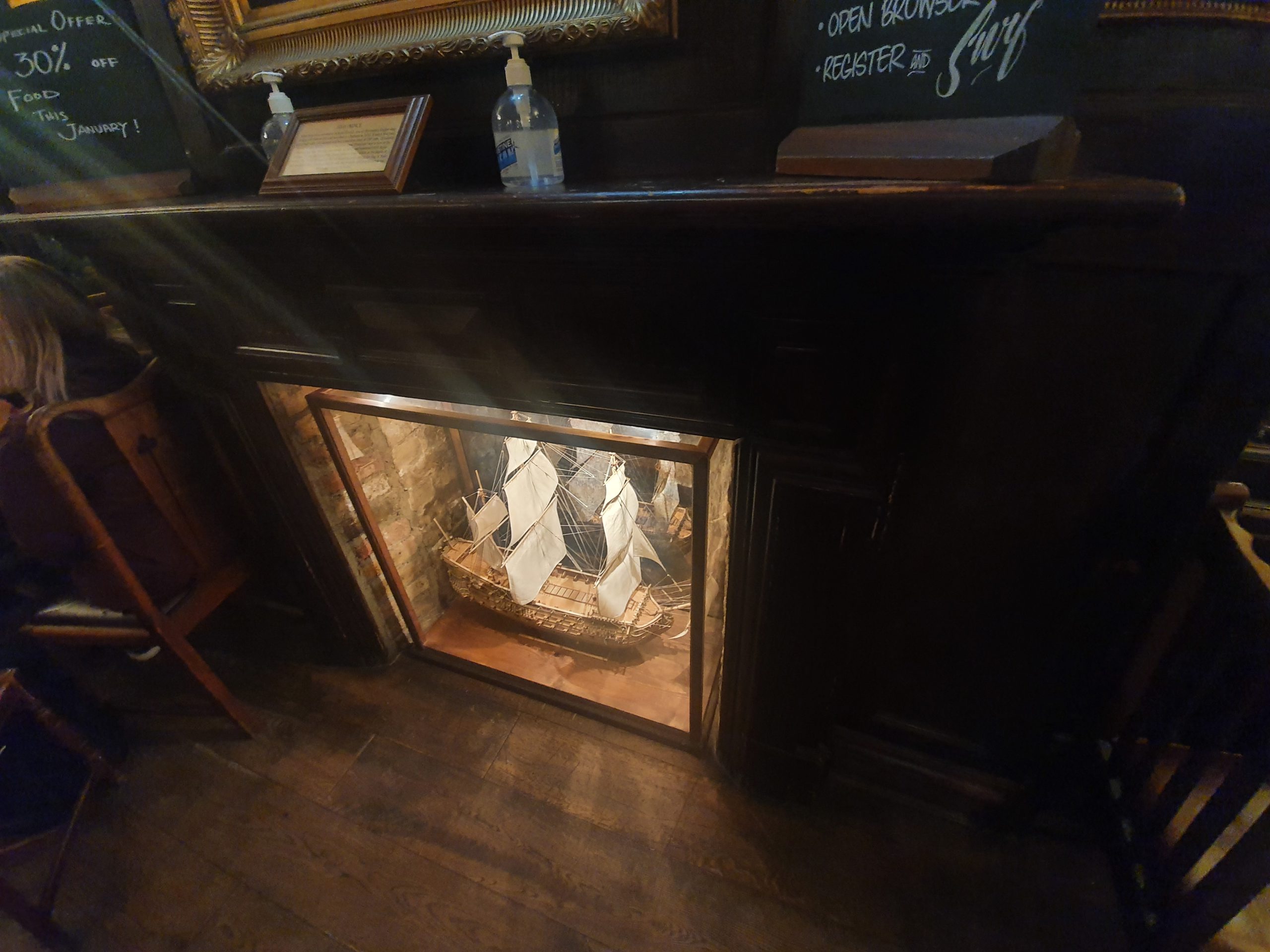 The ship element of the pub’s name is reflected here in the fireplace.