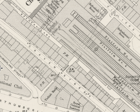 “Former pair of terrace houses, as one public house. c.1731-32, refaced late C.18 and with late C.19 public house front. Yellow stock brick, slate roof. 3 storeys and dormered mansard. 5 windows wide (3 windows to No. 2 and 2 to No. 3). Ground floor has wooden public house frontage with panelled and glazed doors and bar windows articulated by Corinthian pilasters carrying entablature-fascia. Upper floors have recessed glazing bar sashes under flat arches with stucco voussoirs. Parapet with coping. Pub interior retains good late C.19 mahogany bar fittings and some engraved glass. As originally built part of the Craven family’s C.18 development of their Brewhouse property; c.f. Craven Street.”