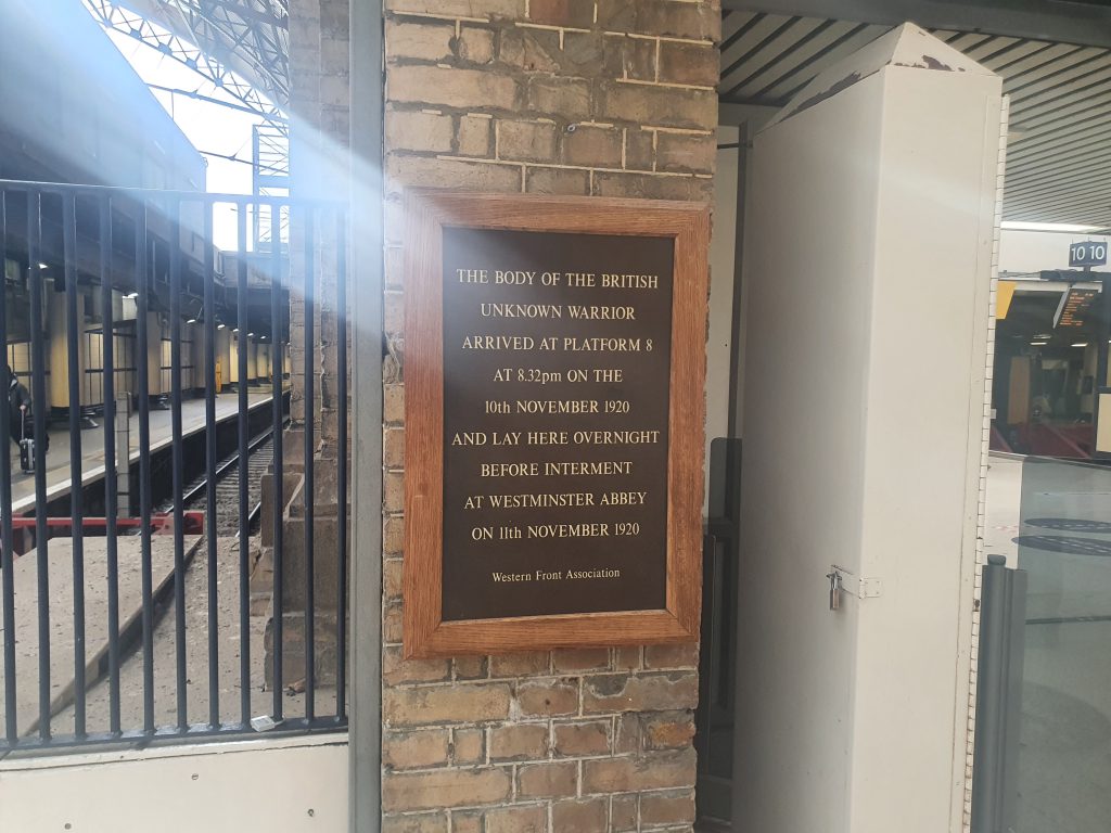 “The body of the British unknown warrior arrived at platform 8 at 8.32pm on the 10th November 1920 and lay here overnight before interment at Westminster Abbey on 11th November 1920”.