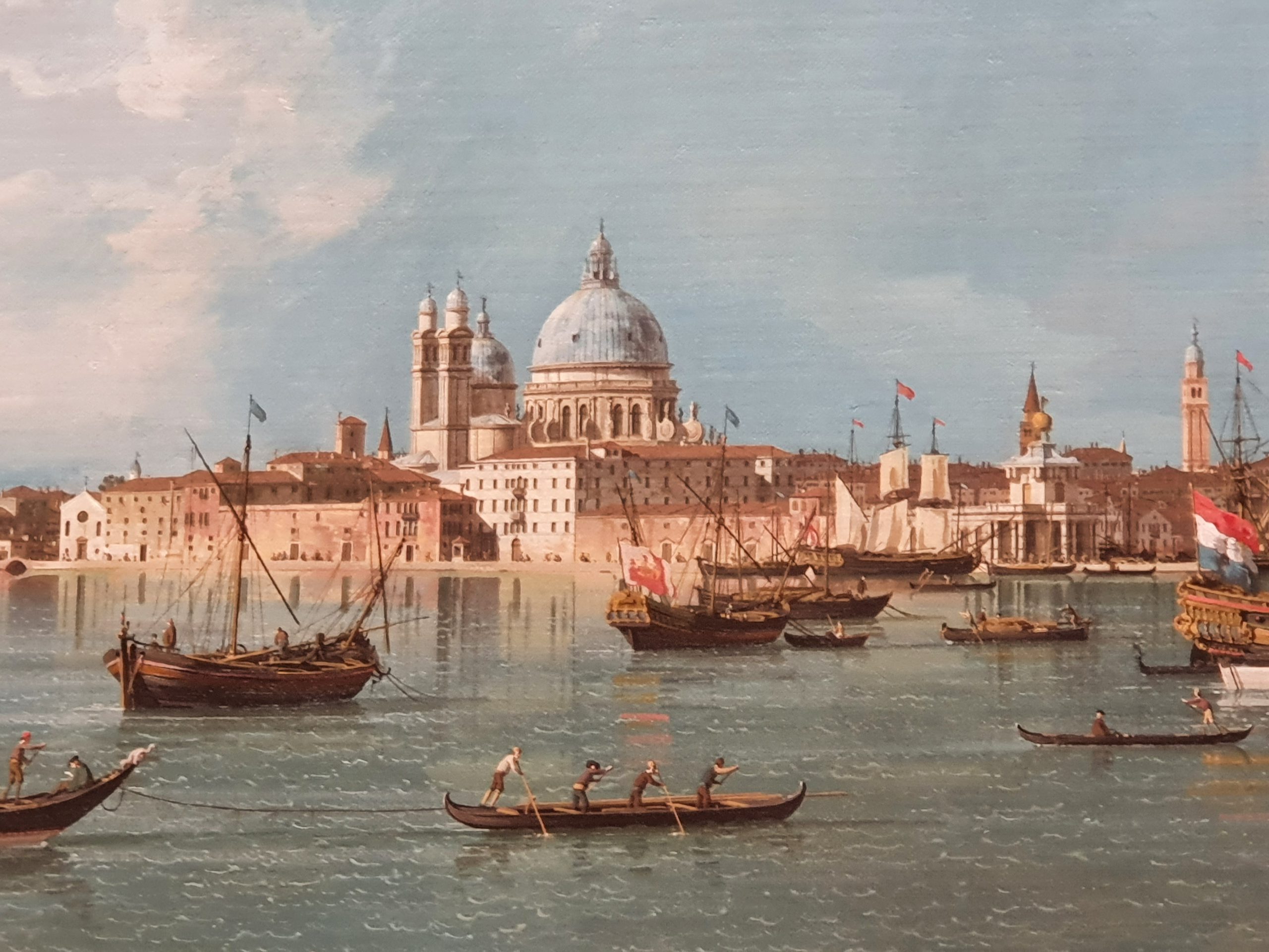 “The figures in the foreground represent different levels of Venetian society; from the seated beggar on the left, the merchants in the centre, and the priest and lawyer engaged in conversation on the right. There is the customary assortment of sea vessels in the picture, including a burchiello, or passenger boat, being towed in the middle ground. This is a superb example of Canaletto’s attention to composition. The triangle of the foreground terrace – framed by the temporarily-docked burchiello with the detail of passengers embarking – is matched by the boat in the middle of the painting. Its two masts are in turn replicated in the vertical soar of the Campanile di San Marco and the dome of Santa Maria della Salute.”