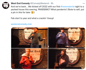Inevitably some material was stronger than others and one comedian had a more muted reaction from the audience as his content was a bit strained. Some of the material is new and the comedians are trying it out with a live audience, with Tom Ward (top-right) having the most surreal of the content, but he integrated music well into his act. Brodkin seemed the smoothest performer out of them all, but he’s had the chance to have more experience and opportunities so I guess that’s inevitable. Incidentally, I hadn’t realised that Brodkin was a trained doctor (I say that not to suggest that some doctors are untrained, just to show he had completed training) before starting a stand-up career, which made his Covid health jokes seem even more appropriate.