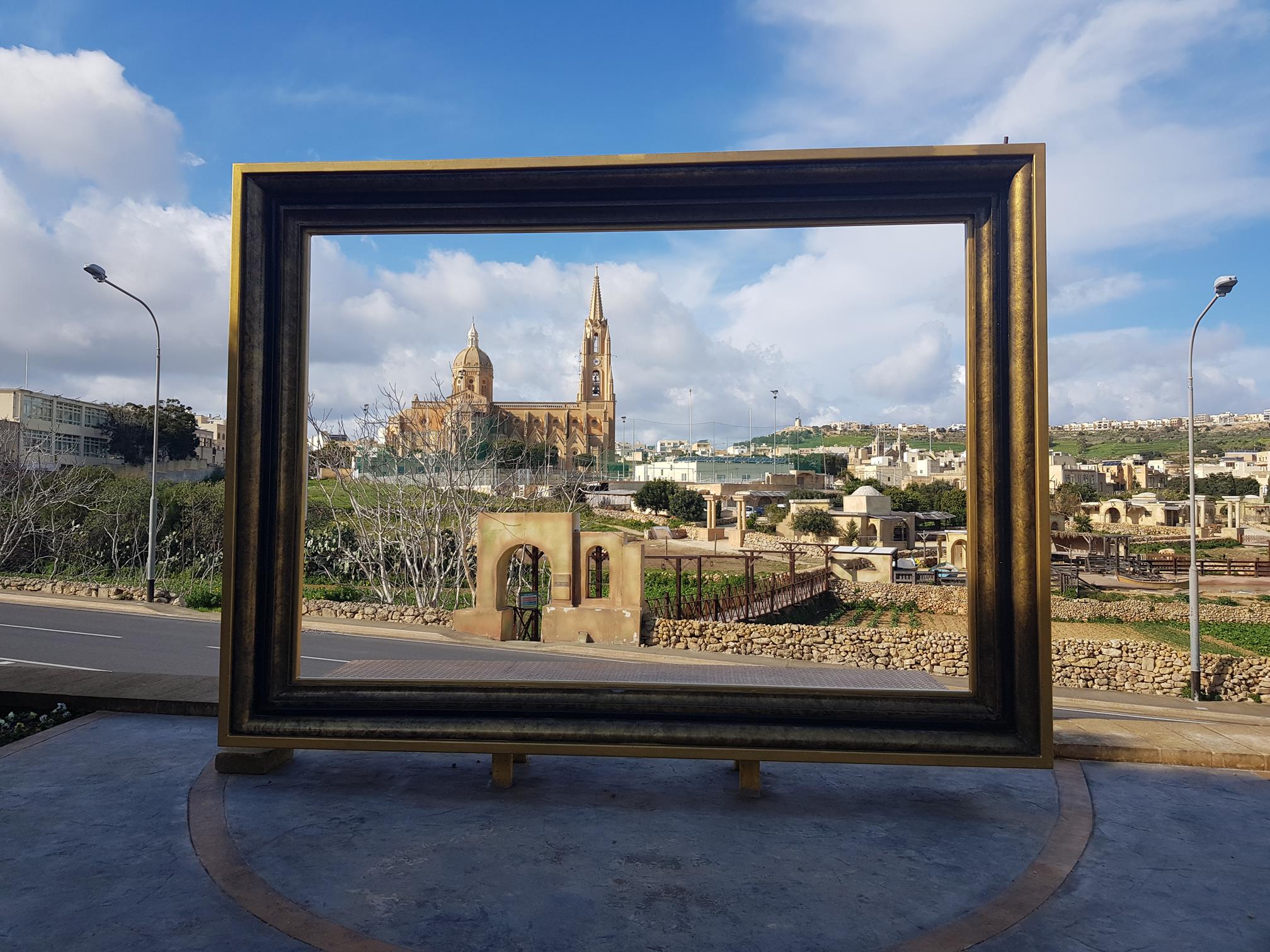 This is a clever little idea, place a frame up at a viewpoint over the town so that visitors can take a photo of themselves and the background. Or in my case, just the background, which is Ghajnsielem Parish Church in the town of Mgarr.