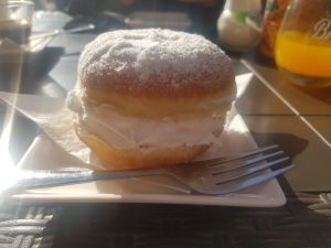 Before leaving Mosta, we went to Cafe Olavi. The lady who worked there was lovely, although commented on how fast Liam spoke when we queried where half the order was. This doughnut was full of cream and some jam as well, a rather decadent little treat. But one that I of course deserved after a morning of exploration. Liam’s latte was hotter than the centre of the sun, but all was well in terms of the taste.