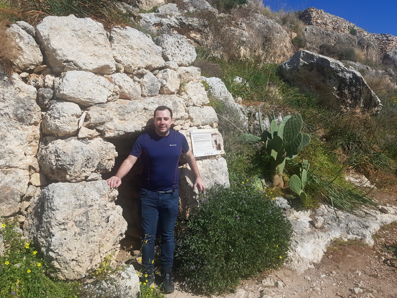 Liam in front of one of the caves. We had at one stage planned to spend this week doing a long distance footpath in Ireland where it would have likely rained, but we were congratulated ourselves on instead picking a slightly more relaxed week in Malta. We also told ourselves that we shouldn’t walk too far as that might somehow spread the Coronavirus, so we thought we’d stay in more urban areas and spend time eating. It’s a sacrifice that we’re prepared to make.