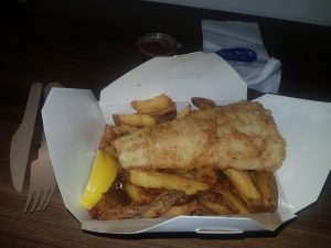 Back to the main event, the food itself was excellent, the batter was full of flavour and had herbs sprinkled throughout it, the fish had a rich and deep taste, with the skin-on chips being crispy on the exterior and sufficiently fluffy on the interior. There was sea salt sprinkled over it, so we were entirely delighted with our choice.