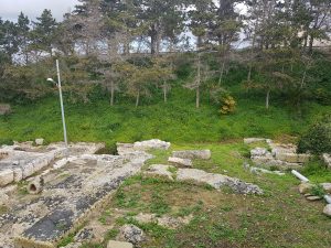 This is the side of the site, with Roman buildings visible in the foreground. They would have been in the background as well, but the British built a road through the site in the mid to late nineteenth century. There were no records made of what was found, so much has unfortunately been lost to history. The Roman site itself was located shortly after, in 1881, during a landscaping project and was then carefully excavated.