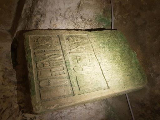 This is a blocking stone inserted to, well, block off a burial area. The stone was reused from a Doric frieze.