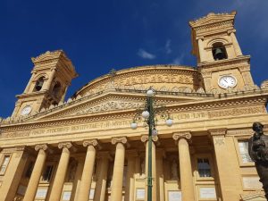 The imposing, but still beautiful, frontage of Mosta Rotunda where work started in 1833 and was finished after just 28 years…. Great civil engineers they had there. Anyway, they built this building around the existing church, and then demolished the church when they had finished it, so that must have been a giant construction site for three decades.